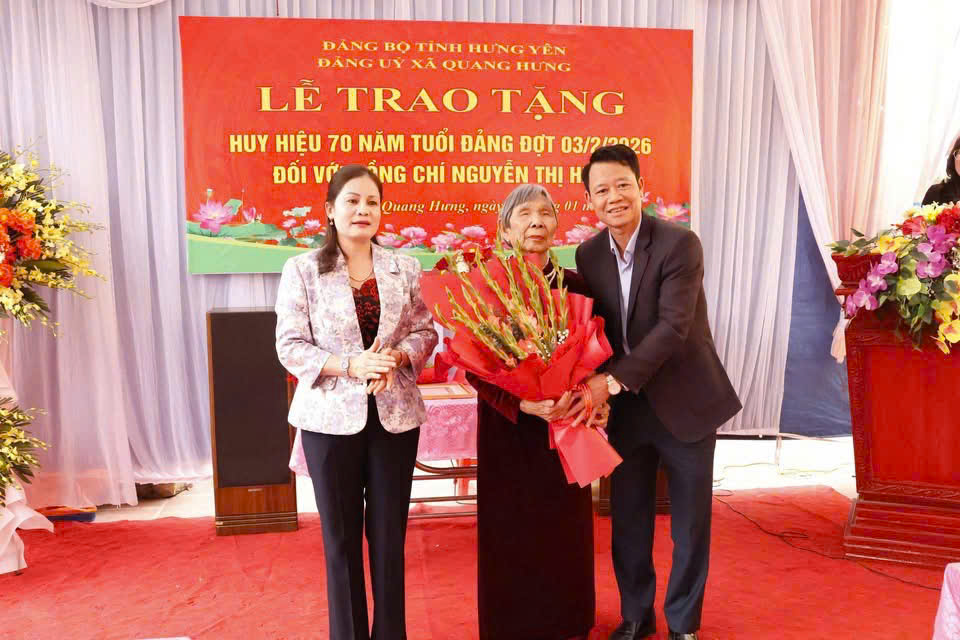Tại buổi lễ, đồng chí Nguyễn Quang Hưng - Ủy viên Ban Thường vụ, Chủ nhiệm Ủy ban Kiểm tra Tỉnh ủy đã trân trọng trao Huy hiệu 70 năm tuổi Đảng và gửi lời chúc mừng, thăm hỏi ân cần tới đảng viên Nguyễn Thị Hiện - người đảng viên lão thành đã trải qua nhiều giai đoạn lịch sử của Đảng và dân tộc, luôn giữ vững phẩm chất chính trị, tuyệt đối trung thành với lý tưởng cách mạng của Đảng, gương mẫu trong sinh hoạt và đời sống, được cán bộ, đảng viên và Nhân dân địa phương tin yêu, kính trọng.