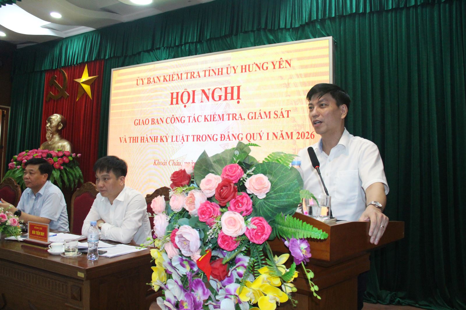 Đồng chí Nguyễn Quang Hưng, Ủy viên Ban Thường vụ Tỉnh ủy, Chủ nhiệm UBKT Tỉnh ủy phát biểu đánh giá cao các kết quả đã đạt được trong thực hiện nhiệm vụ KTGS 3 tháng đầu năm 2026, đồng thời yêu cầu các cấp ủy, UBKT cấp ủy 14 đơn vị cần tập trung lãnh đạo, chỉ đạo, tổ chức thực hiện một số nhiệm vụ trọng tâm Quý II/2026 và trong thời gian tiếp theo: cấp ủy, UBKT các cấp tiếp tục quán triệt và thực hiện nghiêm các chỉ đạo của Trung ương và của tỉnh về công tác KTGS, thi hành kỷ luật trong Đảng; các địa phương, đơn vị, bám sát các mục tiêu, chỉ tiêu thực hiện nhiệm vụ KTGS của Nghị quyết số 11-NQ/TU ngày 30/3/2026 của Ban Thường vụ Tỉnh ủy về đổi mới và nâng cao hiệu lực, hiệu quả công tác KTGS của cấp ủy, UBKT các cấp trong Đảng bộ tỉnh Hưng Yên giai đoạn 2026 – 2030, tầm nhìn đến năm 2035 để rà soát, điều chỉnh Chương trình KTGS nhiệm kỳ 2025 – 2030 và năm 2026 cho phù hợp; tăng cường thực hiện và nâng cao chất lượng công tác giám sát thường xuyên; chú trọng công tác tự kiểm tra; thực hiện việc khắc phục các khuyết điểm, hạn chế qua kết luận KTGS; chủ động nắm tình hình, xem xét, xử lý, giải quyết đơn thư tố cáo, khiếu nại, kiến nghị, phản ánh và các vụ việc phức tạp, tồn đọng ở cơ sở; tiếp tục triển khai thực hiện hiệu quả, chất lượng quy chế phối hợp giữa UBKT các cấp với cấp ủy, tổ chức đảng, cơ quan, đơn vị liên quan để tạo sự đồng bộ trong công tác KTGS; rà soát, kiện toàn các chức danh UBKT các cấp kịp thời bảo đảm tiêu chuẩn, điều kiện, số lượng theo đúng quy định; đồng thời, chú trọng đào tạo, bồi dưỡng, tập huấn nâng cao nghiệp vụ cho đội ngũ cấp ủy, cán bộ làm công tác kiểm tra; đẩy mạnh công tác chuyển đổi số bảo đảm đúng lộ trình của ngành kiểm tra Đảng…
